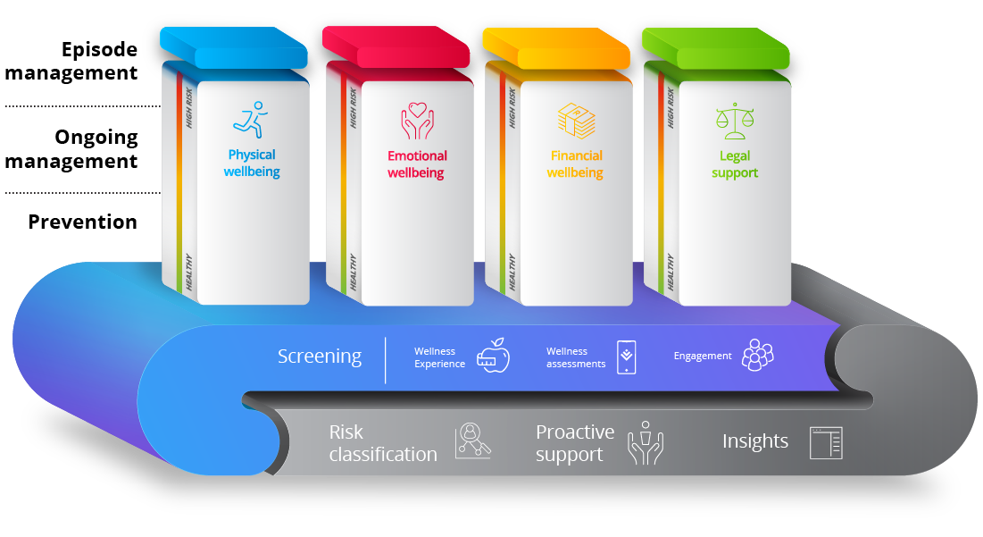 Healthy Company offers various levels of interventions depending on the plan type. From prevention and education to episode or ongoing management across physical, emotional and financial wellbeing, as well as legal support.